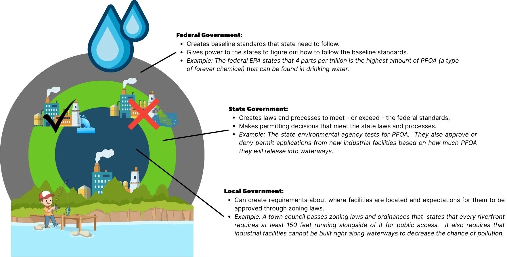 In general, the federal, state, and local governments all take a role in approving new facilities: