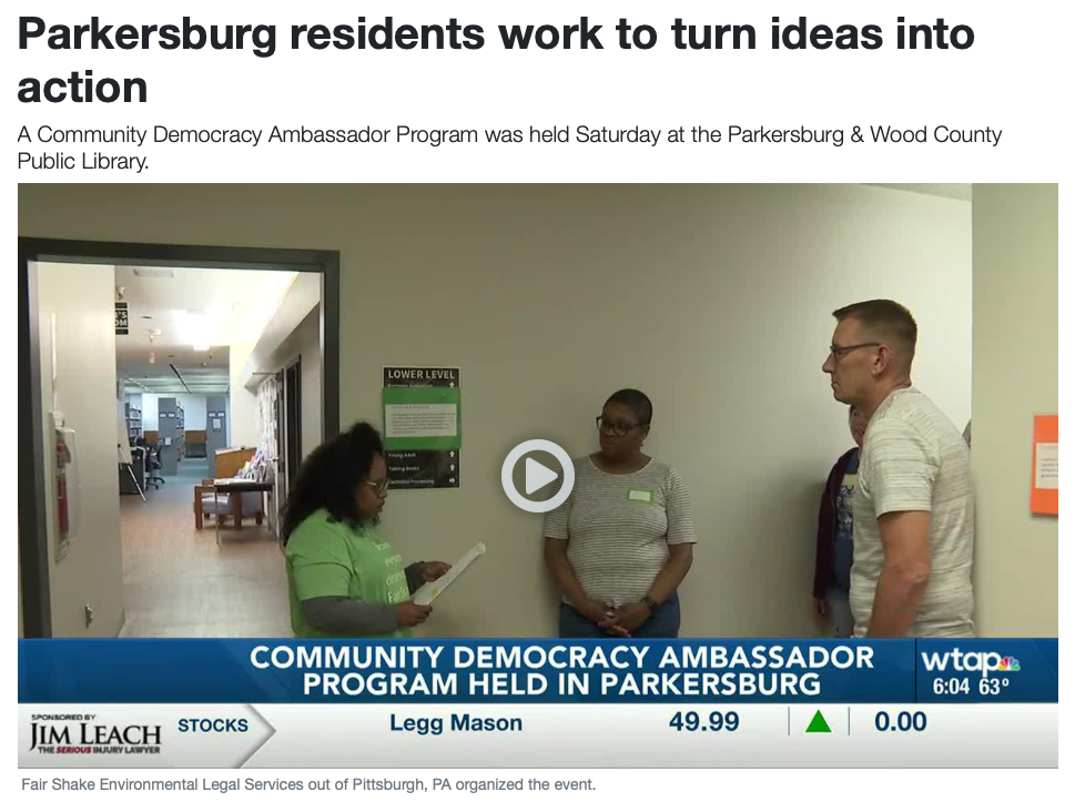 The area’s first Community Democracy Ambassador Program took place Saturday at the Parkersburg & Wood County Public Library’s Emerson branch. Fair Shake Environmental Legal Services out of Pittsburgh, Pennsylvania organized the event.